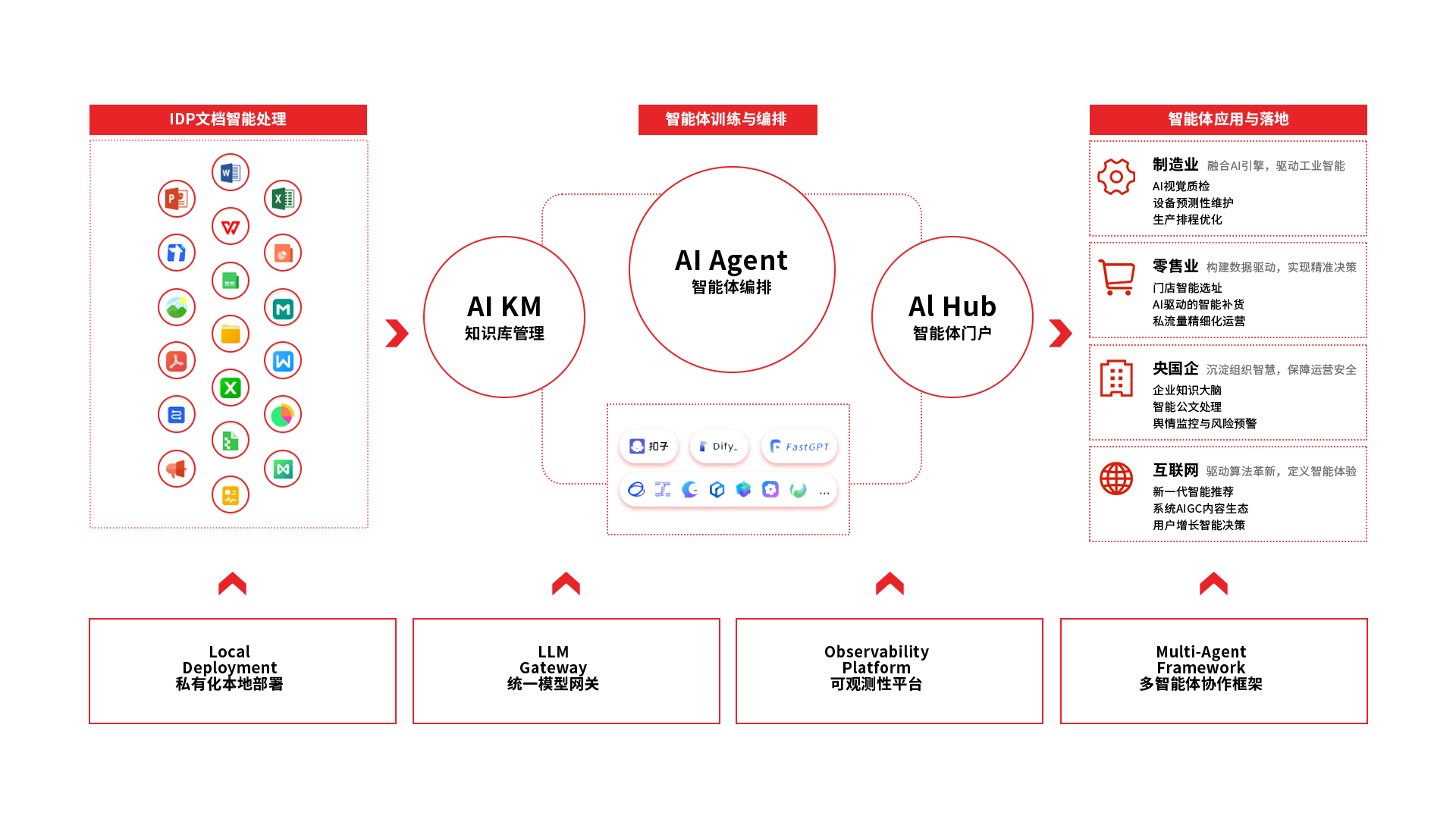 基于AI技术,为企业打造智能知识库以沉淀复用知识,落地业务流程自动化以提升执行效率,强化运营决策支持与优化供应链管理,全面提升企业效率与竞争力。 AI+CRM、AI+OA